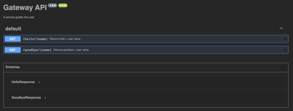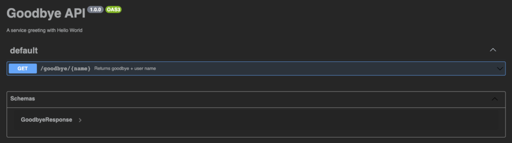 Our Goodbye API is exactly like the Hello API. It contains a single endpoint: /goodbye/{name}. This endpoint, just like the Hello API, responds to the client with Goodbye (e.g. Goodbye Yonatan).
