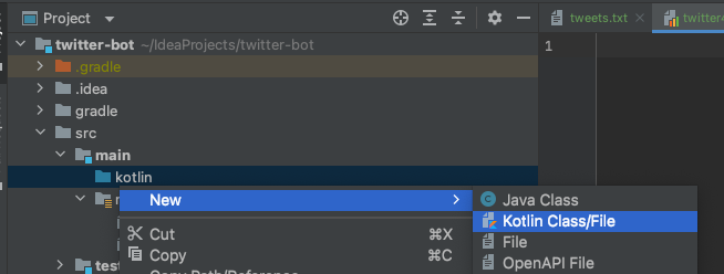 Create a new Kotlin file called TwitterBot.kt in the src/main/kotlin directory. Replace the existing code with the following: