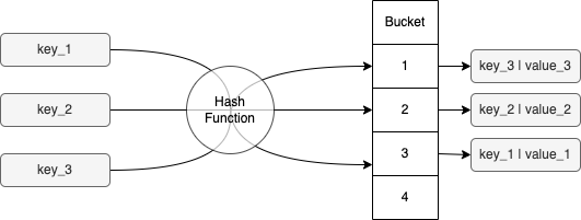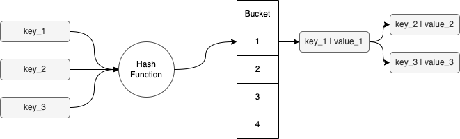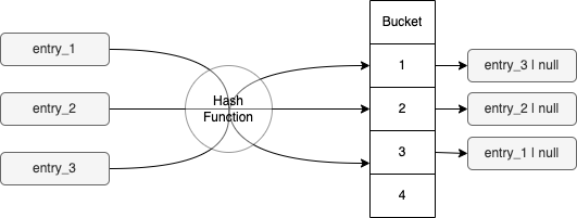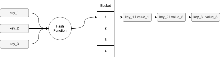 When we add a new element to our map, the hash code of this key is calculated first. According to its value, a bucket is selected. That bucket will contain the value (in this case, our object). In case of collision (2 or more objects with the same hash code), the key and the value are stored as a pair using some sort of data structure (e.g., a linked list).
